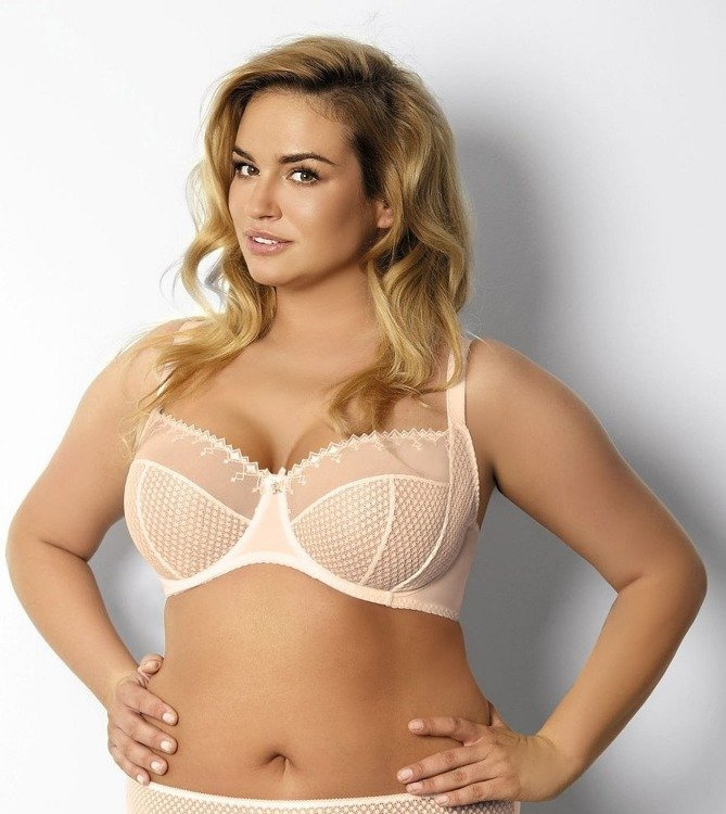 Sujetador suave con aros. Copas de delicado encaje de lunares, línea superior de malla decorada con llamativos bordados. Laterales, reforzados con ballenas verticales, tirantes no desmontables.