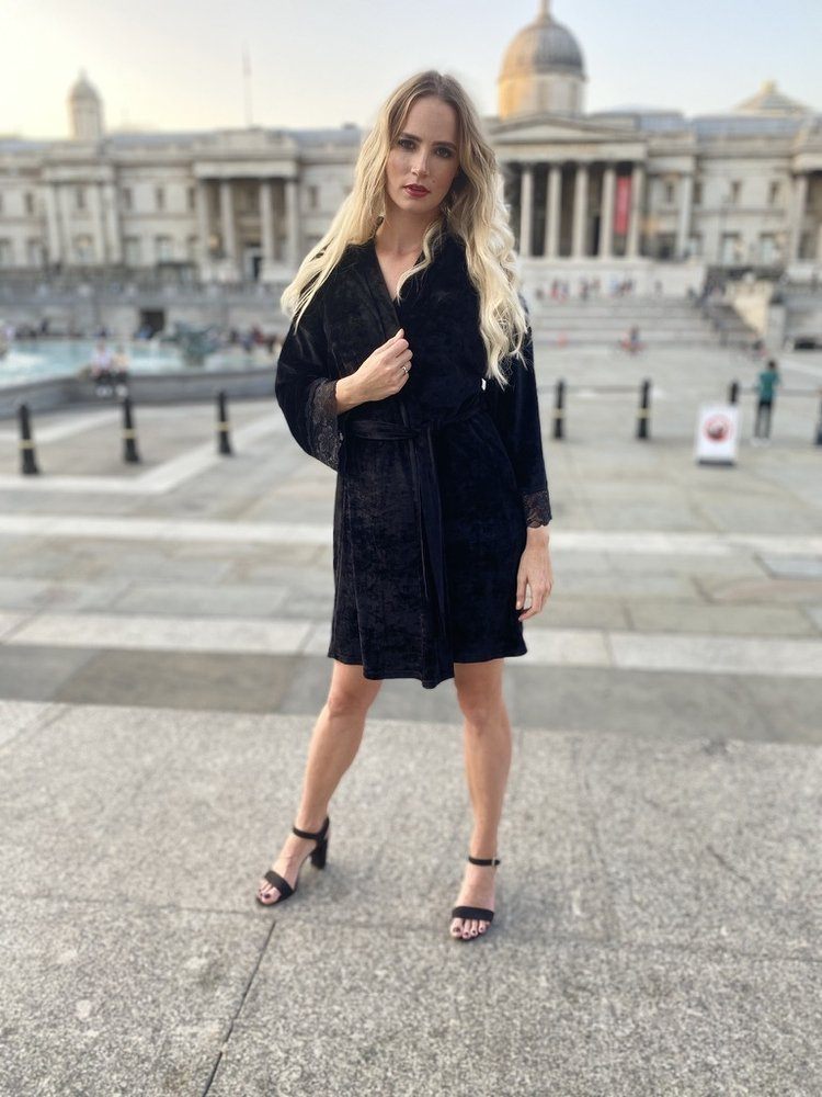 Bata de señora de terciopelo de bambú de alta calidad. Corto, atado a la cintura, manga 3/4. Los puños están decorados con un llamativo encaje floral. El albornoz se adapta perfectamente a la forma del cuerpo, es extremadamente suave y ligero. Envolverse en él después del baño es un placer!