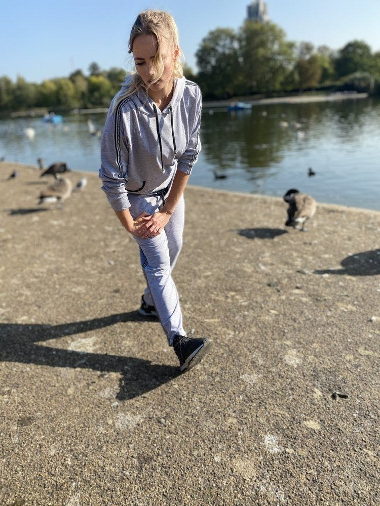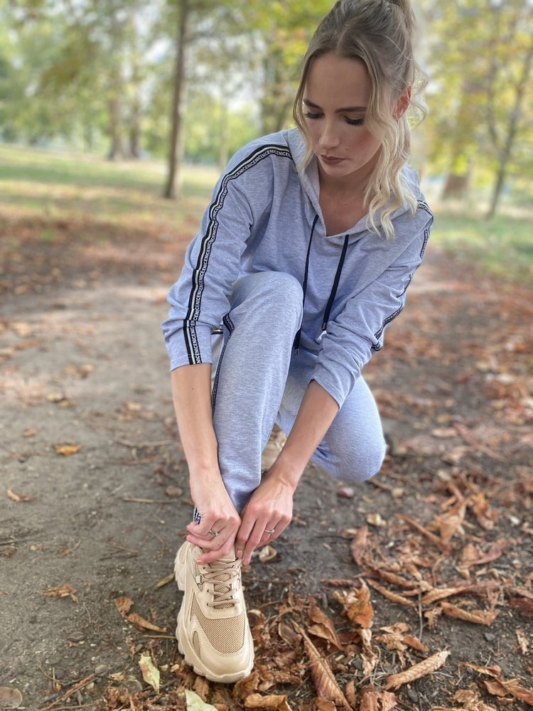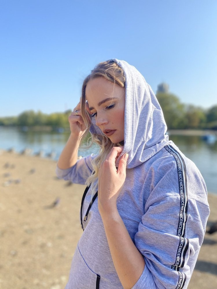 Cómodo chándal de mujer de material agradable al cuerpo. Sudadera de manga larga con capucha. A nivel abdominal, la bolsa. Pantalones con bolsillos. Cinturón con cordón de ajuste. Mangas y perneras ribeteadas con letras.