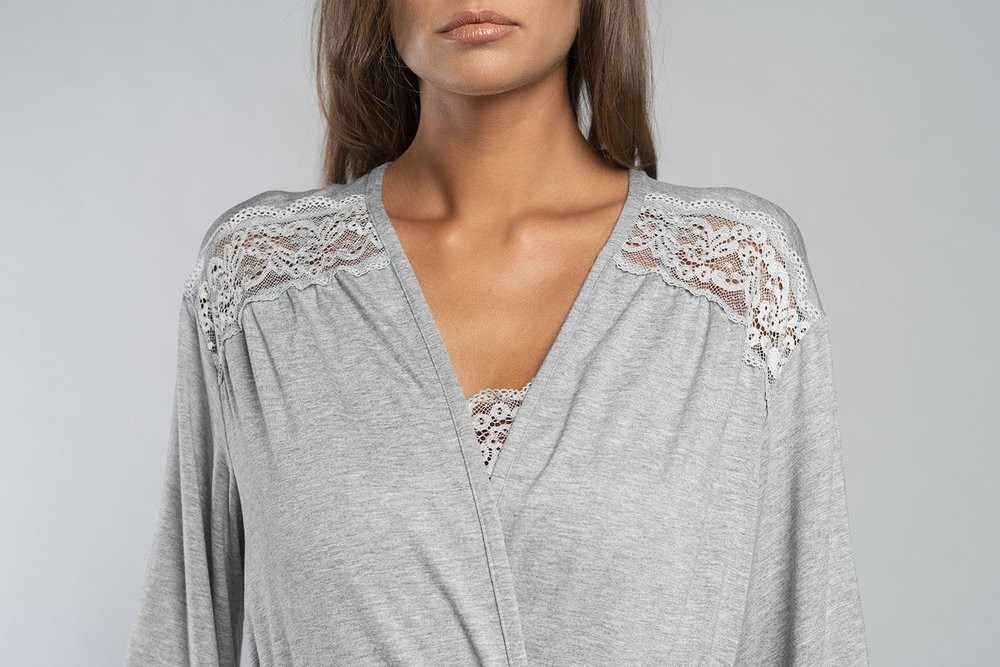 El modelo tiene bolsillos en los laterales y un cómodo lazo en la cintura. Decorada con delicados encajes en mangas, oracon escote.