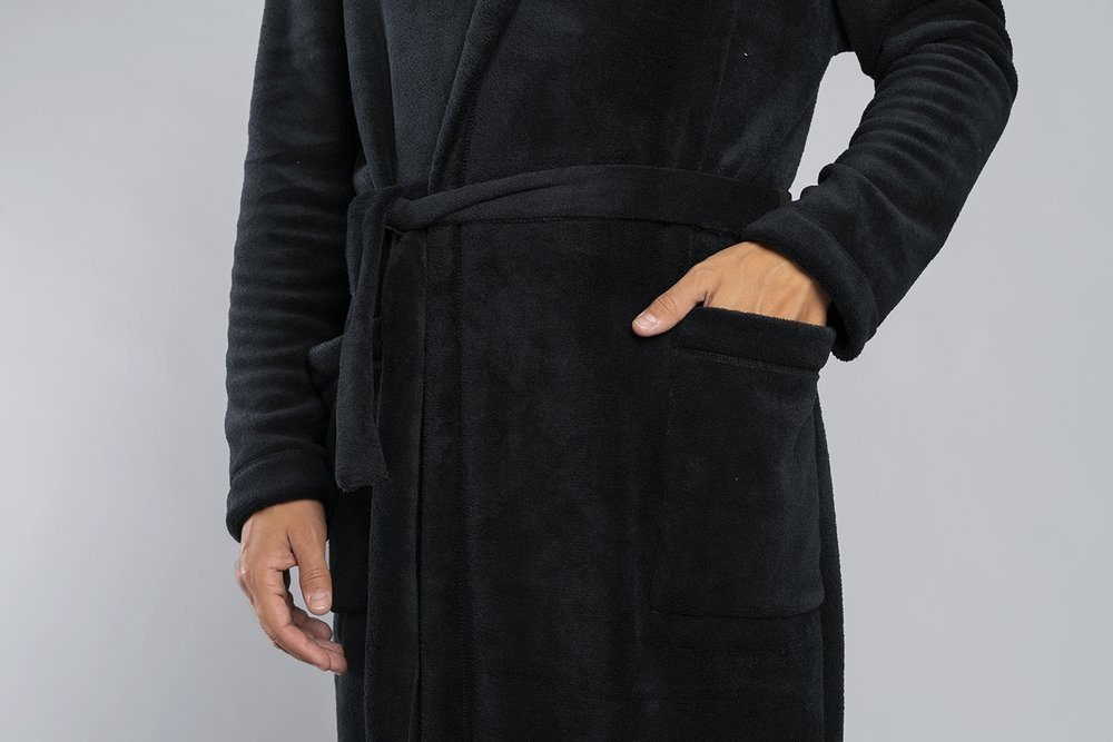 Largo albornoz de hombre con capucha, atado a la cintura.