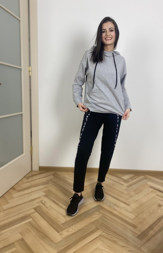 Cómodo chándal de mujer de material agradable al cuerpo. Sudadera de manga larga con capucha. A nivel abdominal, la bolsa. Pantalones con bolsillos. Cinturón con cordón de ajuste. Mangas y perneras ribeteadas con letras.