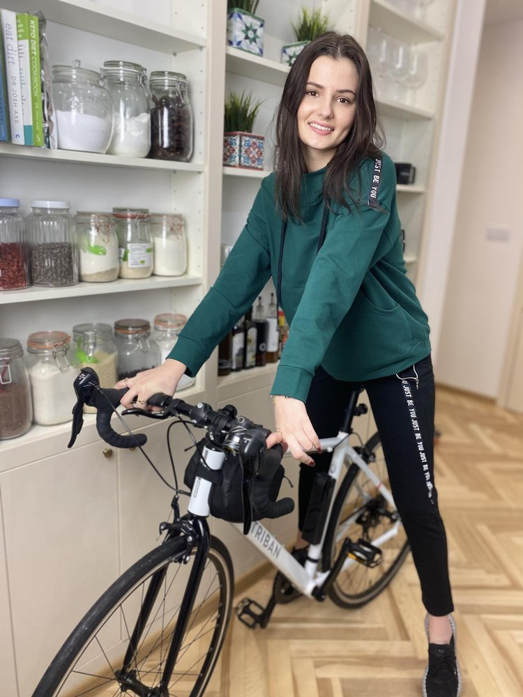 Cómodo chándal de mujer de material agradable al cuerpo. Sudadera de manga larga con capucha. A nivel abdominal, la bolsa. Pantalones con bolsillos. Cinturón con cordón de ajuste. Mangas y perneras ribeteadas con letras.