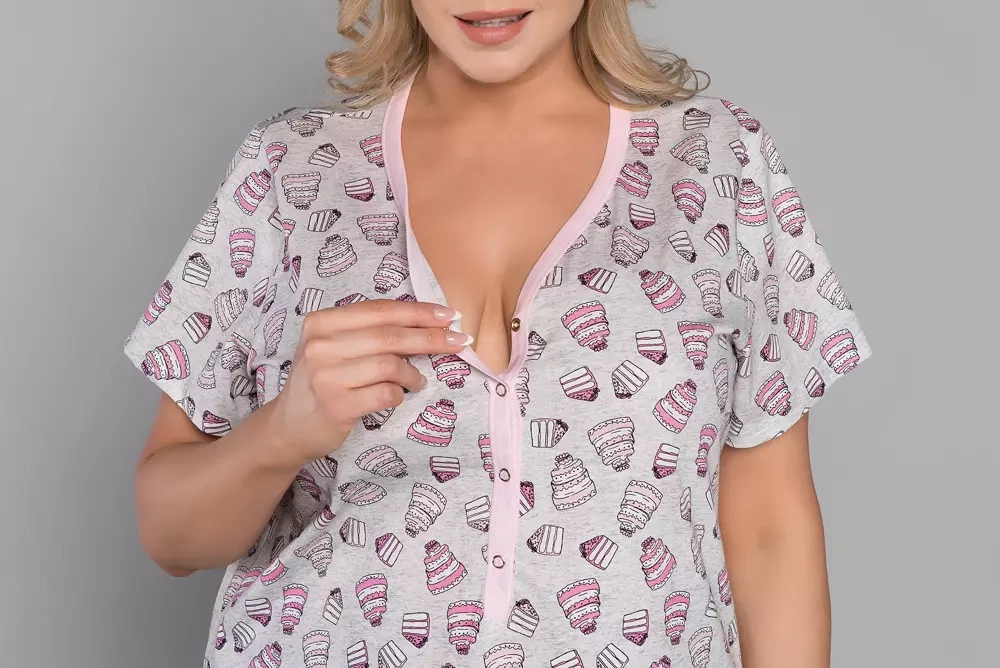 Esta temporada servimos una encantadora camisa Dolce en dulces y cremosos pasteles y cupcakes. Es un modelo muy práctico y extremadamente cómodo. El algodón natural que lo compone envuelve agradablemente el cuerpo y proporciona comodidad a quien lo lleva. La parte superior desabrochada hace que la camisa sea ideal también para mujeres en periodo de lactancia.