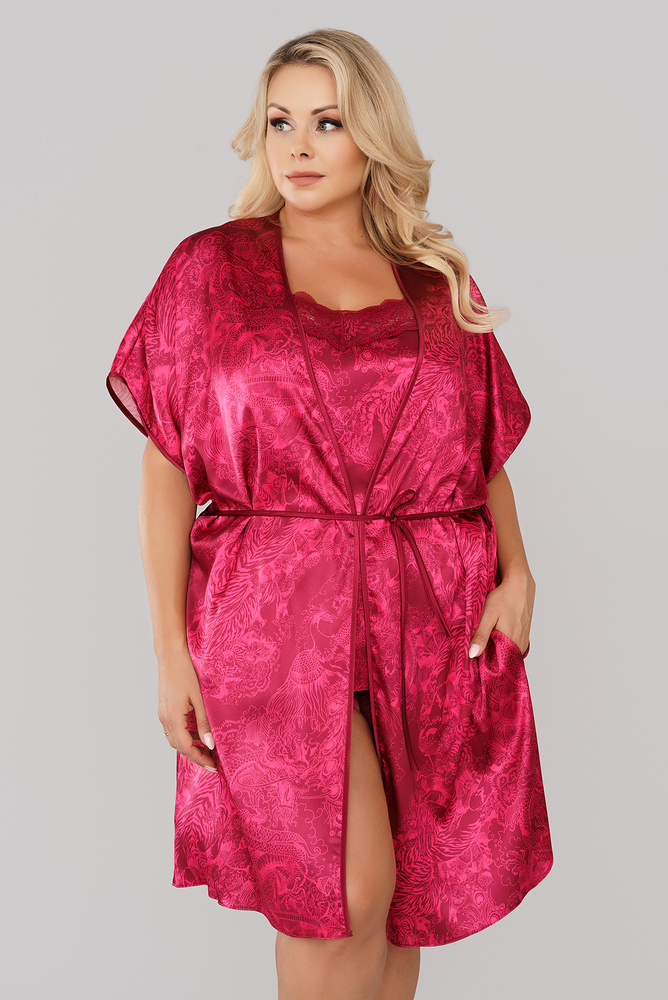 La bata de satén Impresja es garantía de clase y elegancia. Color vino tinto intenso y motivos orientales perfectos para una cita nocturna con la persona amada. El lazo frontal y el profundo escote en V acentuarán y realzarán tu silueta. Con el pijama o la camisa Impresja puedes crear un conjunto único e inolvidable.
