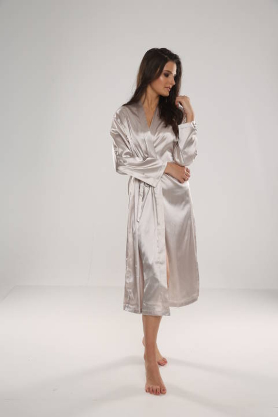 El sencillo albornoz largo de satén impresiona por su elegancia y su uso casi versátil.