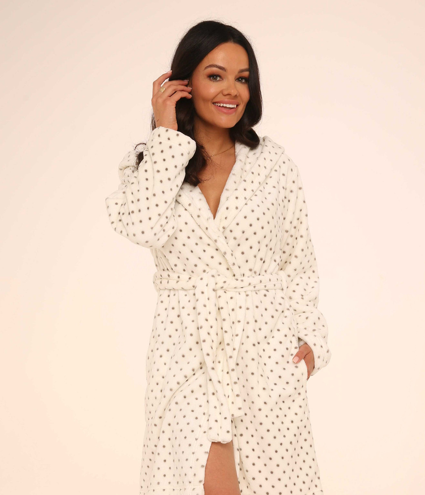 Albornoz de corte recto con cuello para mujer FOREX. Largo hasta la pantorrilla, bolsillos laterales, cintura con lazo para cinturón. Todo en guisantes. El albornoz se adapta perfectamente a la forma del cuerpo, es extremadamente suave y ligero, de suave tejido de punto. Envolverse en él después del baño es un placer!