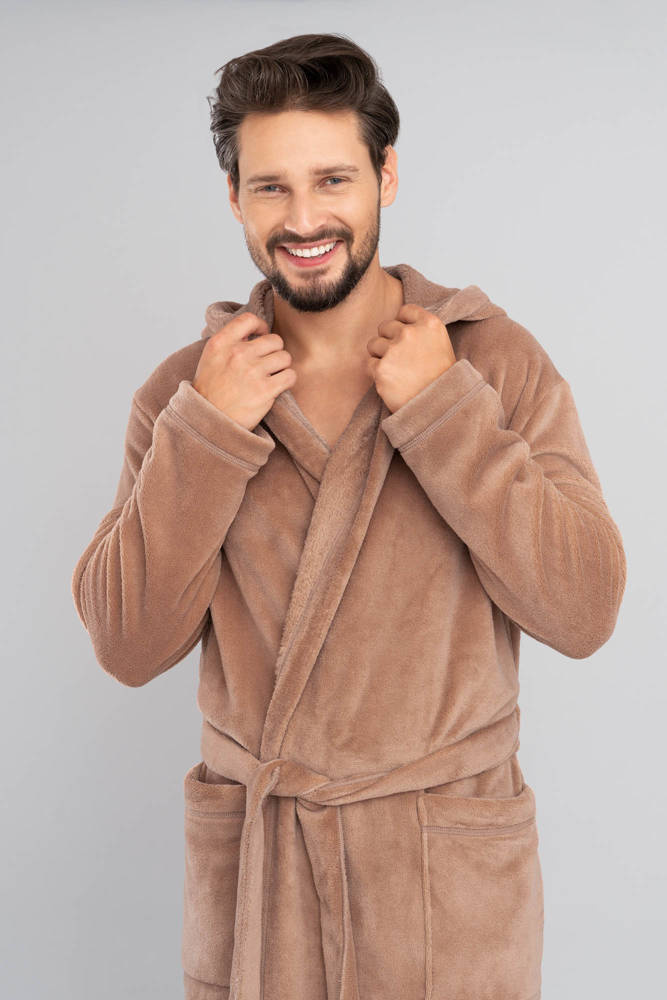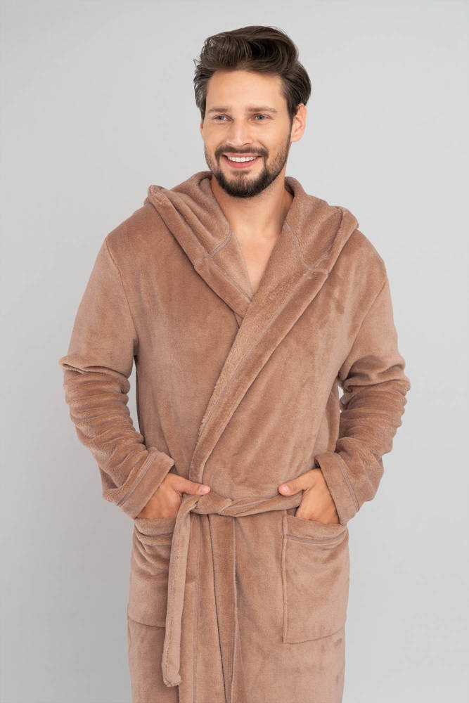 Largo albornoz de hombre con capucha, atado a la cintura.