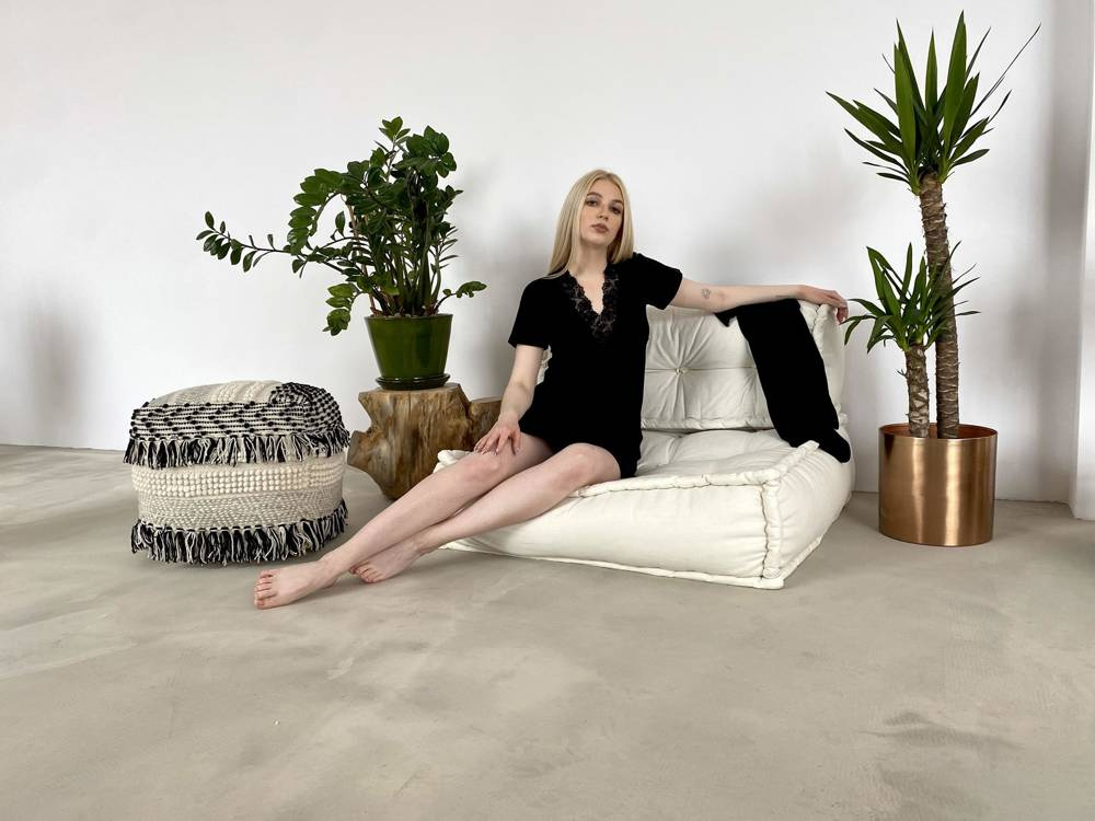 Camisa de señora, de viscosa de alta calidad, con mangas cortas. Escote en V, puños con amplio estampado floral de encaje. Hasta la rodilla. Toda mujer se sentirá especial con él !!
