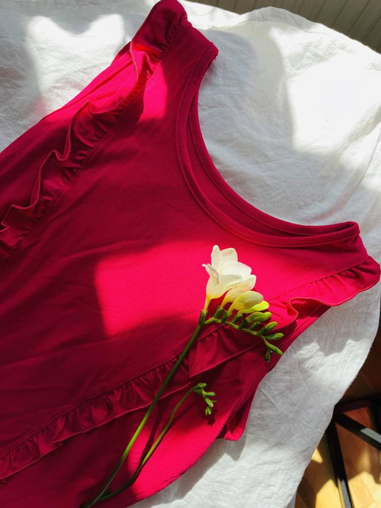 Elegante camiseta de hombros anchos para mujer. Modelo realizado en seda viscosa de alta calidad. Escote y cintura decorados con un encantador volante. Atraerá a las mujeres amantes de la suavidad y la libertad.