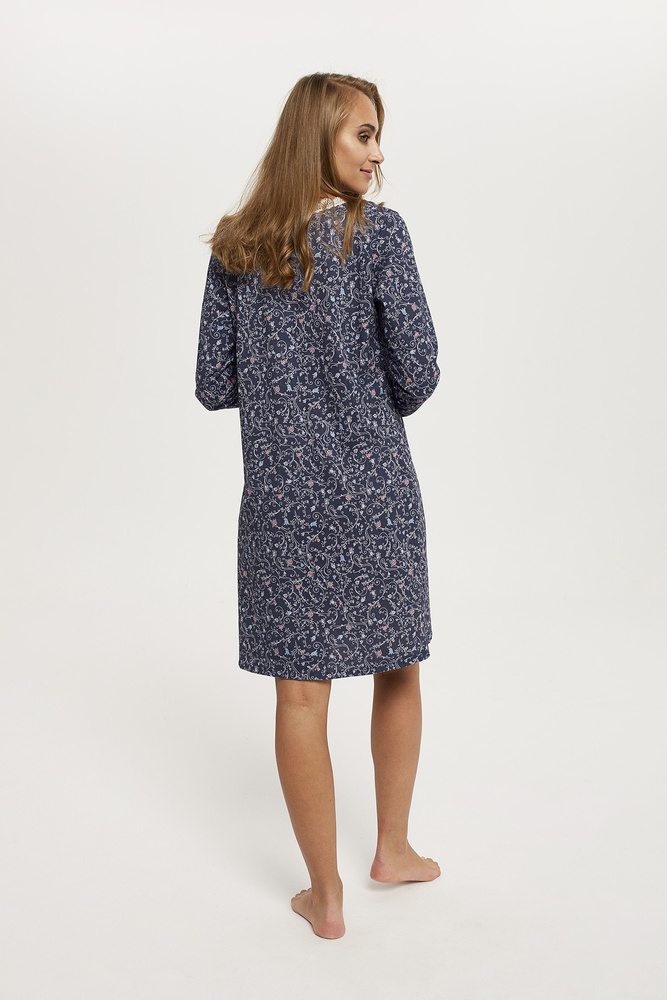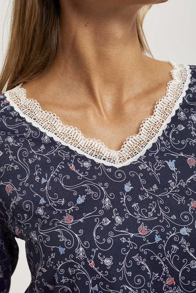 Camisa estampada de manga larga para mujer. Un bonito motivo sobre fondo oscuro llama la atención y añade encanto a la camiseta. El escote está ribeteado con encaje en contraste. La longitud total de la camisa llega antes de la rodilla. El algodón fino de alta calidad utilizado para coser la camiseta es seguro y respetuoso con la piel. La calidad del tejido utilizado y la precisión de las costuras garantizan una larga duración.