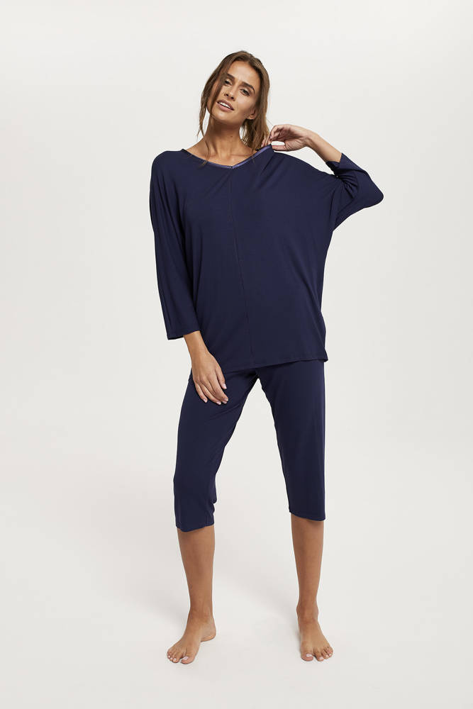 Suave pijama de mujer con mangas y pernera 3/4. De viscosa enriquecida con elastano. Disponible en azul marino. Los pijamas realzan la silueta de la mujer, acentuando sus atributos. La parte superior del pijama se ha realzado con interesantes pespuntes en el centro de la parte delantera, mientras que el escote se ha rematado con un ribete de satén azul marino, que añade un toque elegante al conjunto.