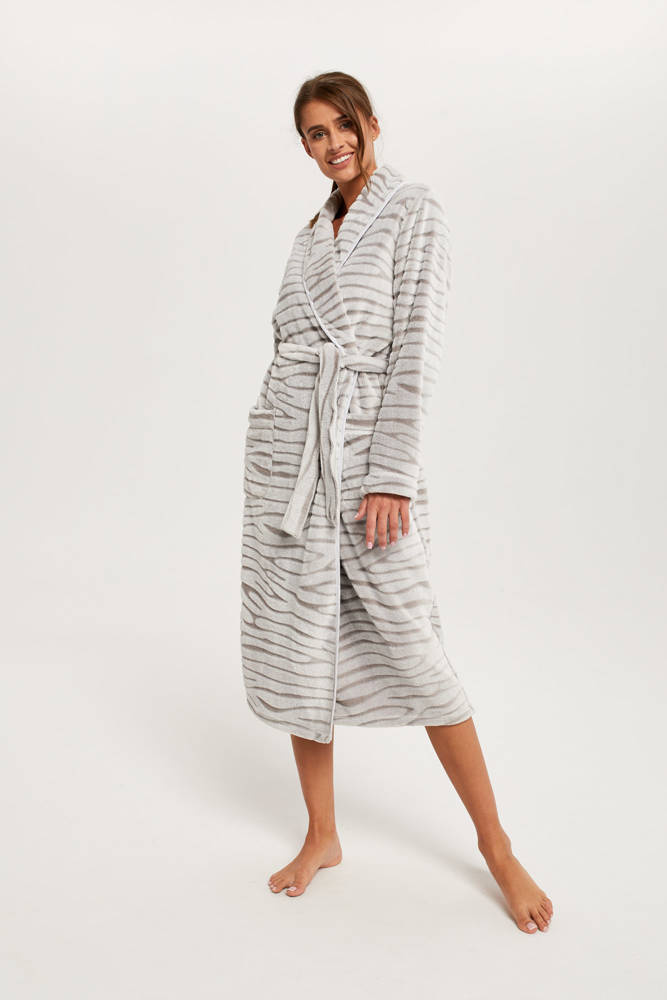 Suave y agradable al tacto, el albornoz Asma es perfecto para el otoño y el invierno. El suave y esponjoso tejido es bipolar, que posee un excelente aislamiento térmico, garantizando calidez y confort. El fuerte estampado animal combina fantásticamente con la sutil combinación de colores grises, dando al conjunto un carácter único. . Una ventaja adicional es el práctico atado en la cintura y los bolsillos funcionales.