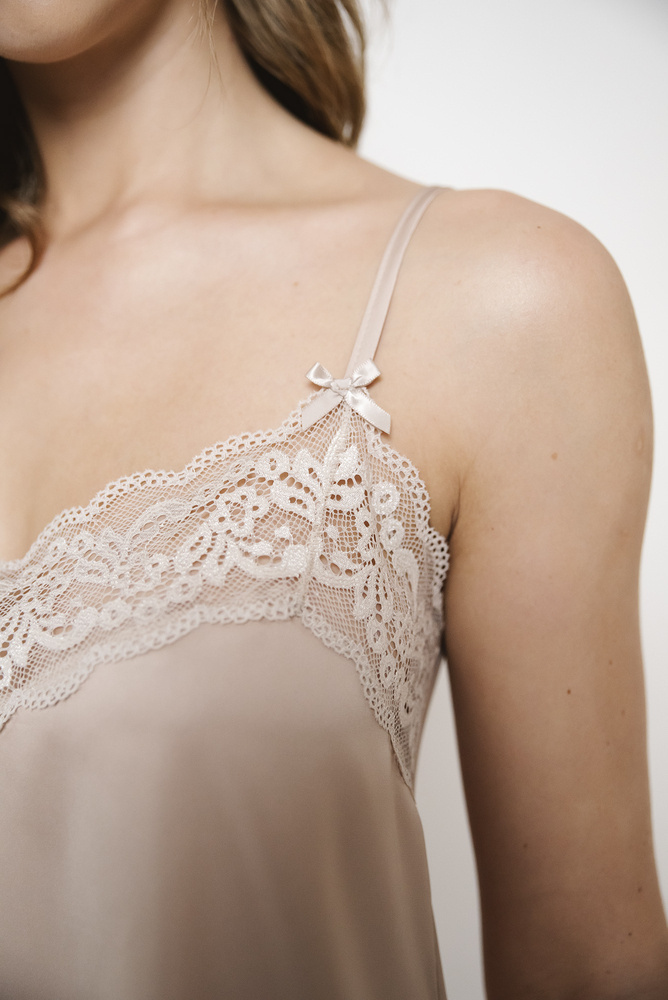 Encaje decorativo en la parte delantera del chemise, rematando el escote y el dobladillo.