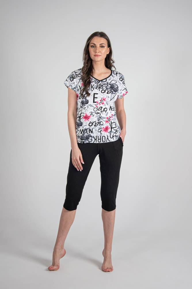 Pijama de dos piezas de De lafense confeccionado en viscosa de alta calidad. Ideal para un sueño reparador y para empezar bien el día con el primer café de la mañana. Camiseta de manga corta, estampada. Pantalón liso, largo 3/4.