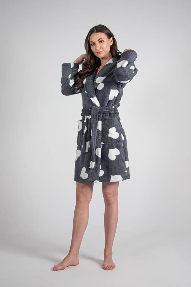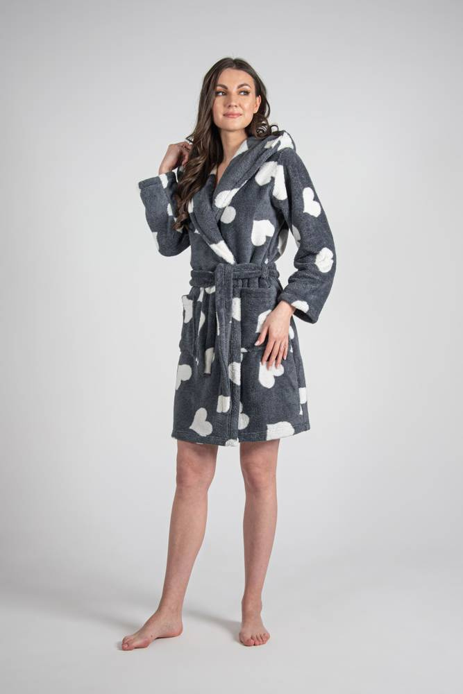 Albornoz de corte recto con capucha para mujer FOREX. Largo hasta la rodilla, bolsillos laterales, cintura con lazo para cinturón. El albornoz se adapta perfectamente a la forma del cuerpo, es extremadamente suave y ligero, de suave tejido de punto. Envolverse en él después del baño es un placer!