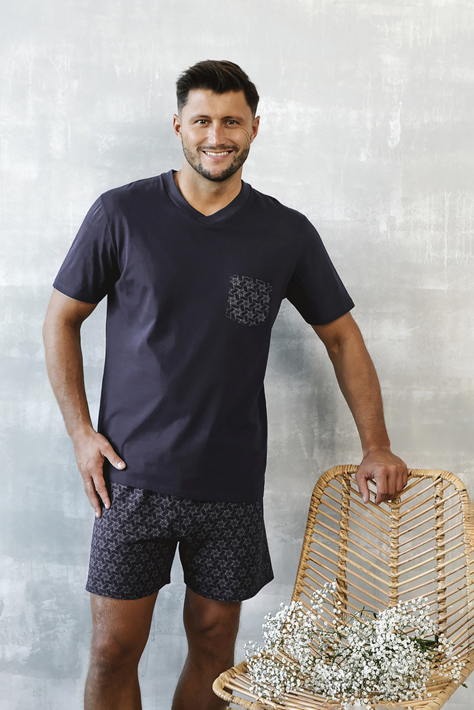 Extremadamente agradable sobre la piel gracias al uso de punto de algodón de gran confort. El corte clásico será muy cómodo para cualquier hombre. El top azul marino y los pantalones cortos estampados forman un bonito conjunto clásico.