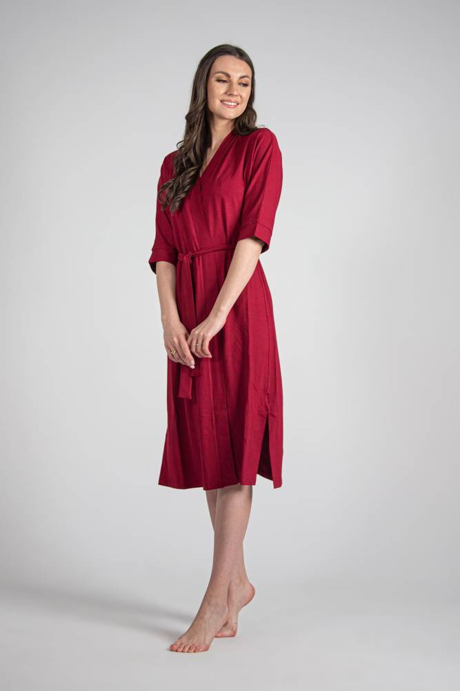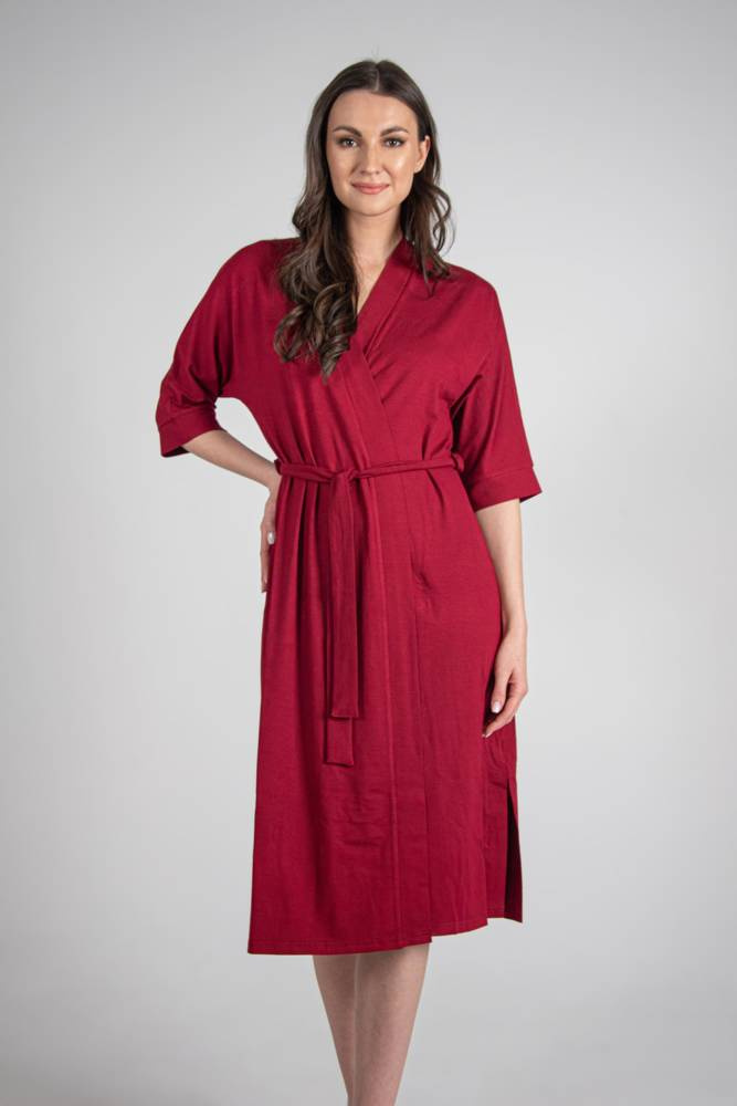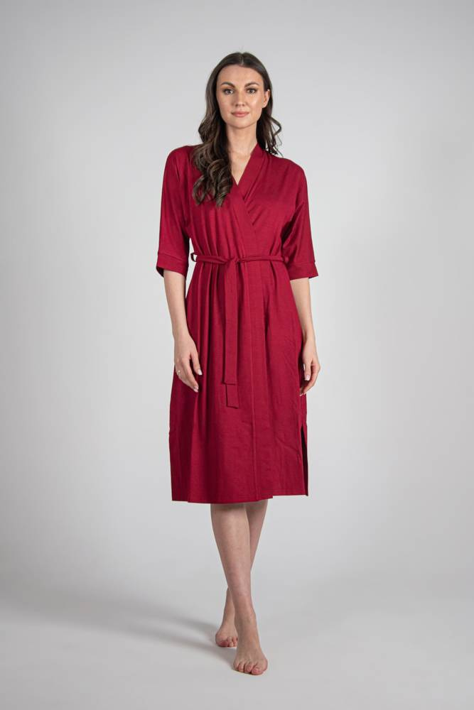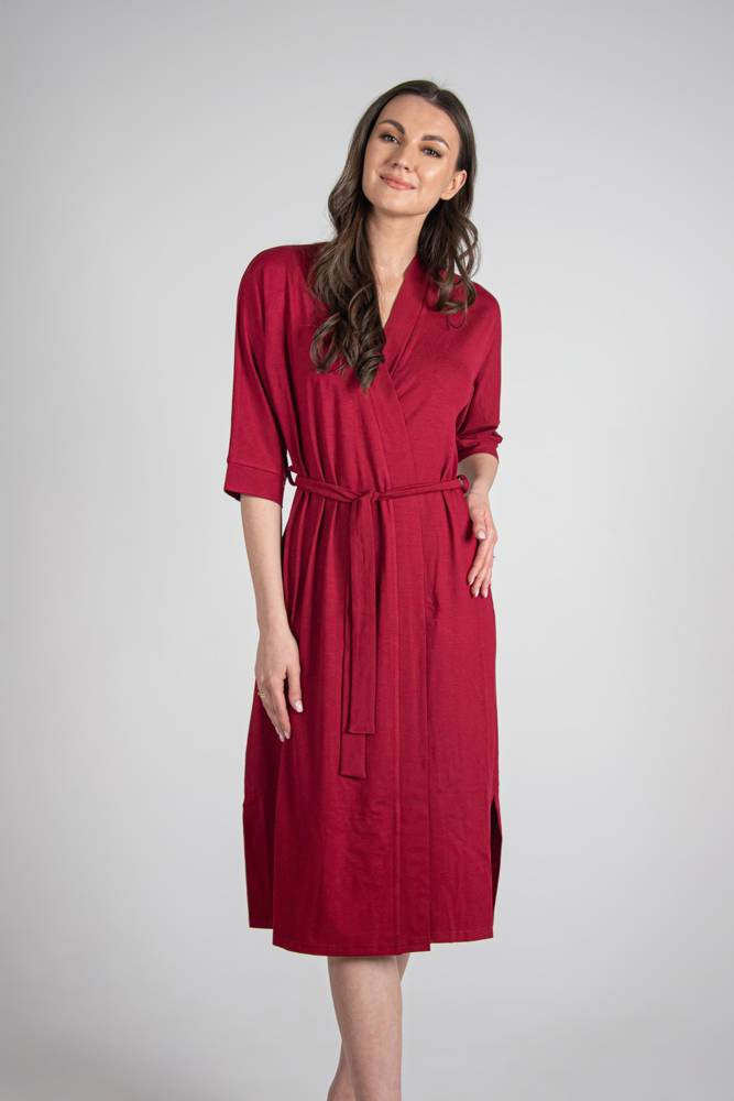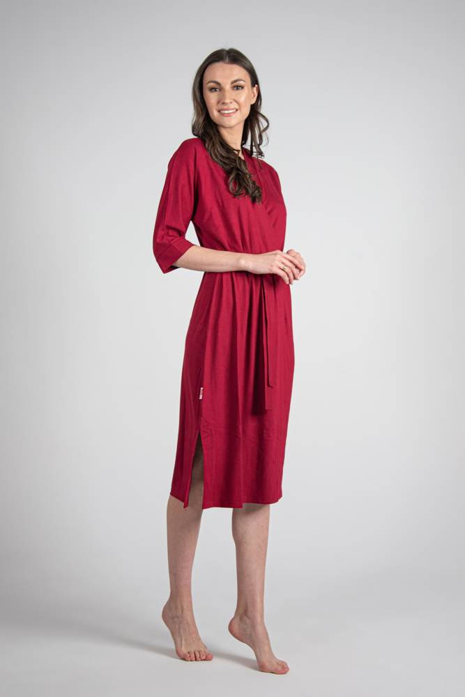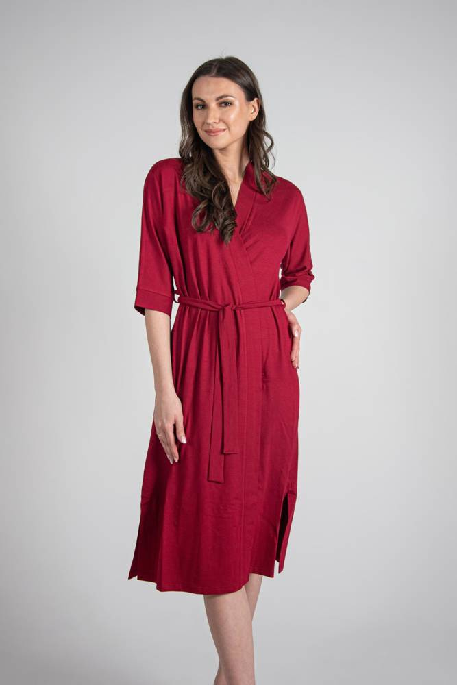El modelo de corte más largo envuelve perfectamente el cuerpo, mientras que las mangas 3/4 y el lazo en la cintura acentúan el talle, aportando ligereza y feminidad al conjunto.