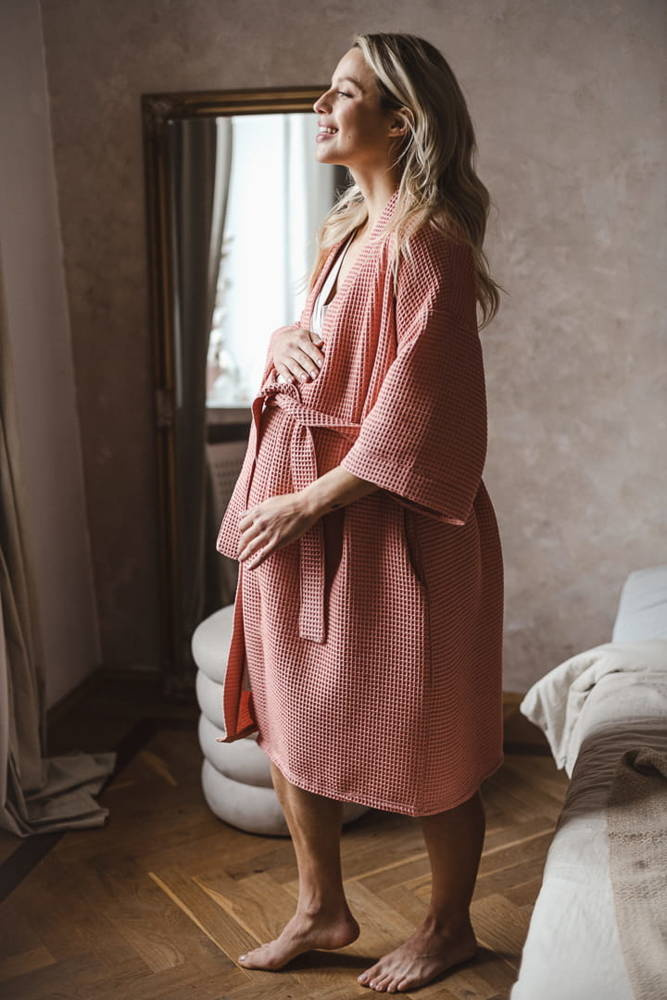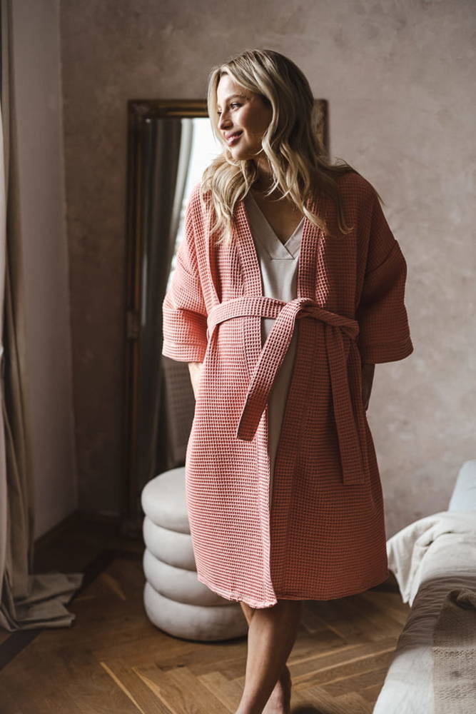 Szlafrok został zaprojektowany z myślą o mamach, dlatego jest nieco dłuższy, abyś spokojnie okryła nim ciążowy brzuszek. Po porodzie bez skrępowania b będziesz mogła spacerować po szpitalnym korytarzu lub na leżąco nakarmiła maluszka w połogu. Posiada kieszenie na niezbędne drobiazgi i pasek do regulowania szerokości.