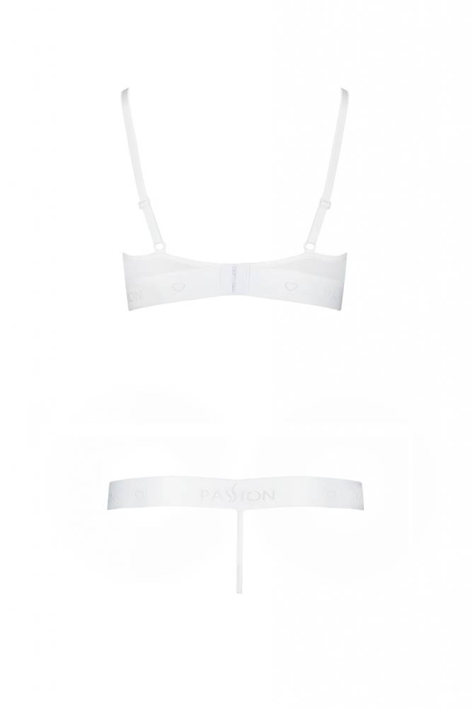 Sujetador abierto inusual. Diseñada para mujeres a las que les gusta la lencería atrevida e inusual. Acentúa perfectamente los pechos y los seductores tirantes que rodean el cuerpo añaden picante al conjunto. El conjunto incluye un sujetador abierto y un tanga de talle alto
