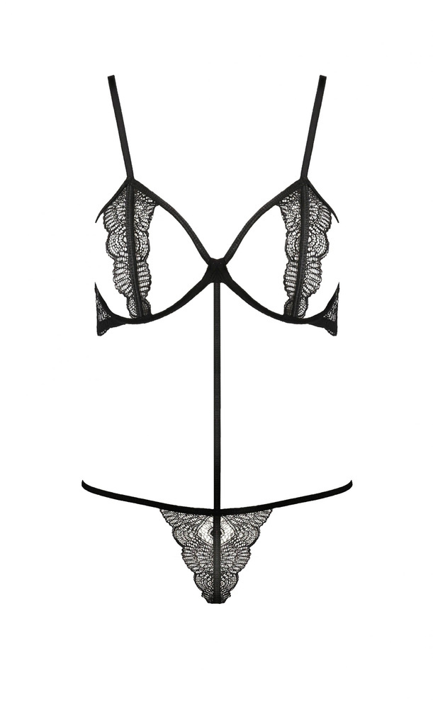 Bikini de corte inusual. Atrevidas copas de sujetador abiertas enriquecidas con sutil encaje .