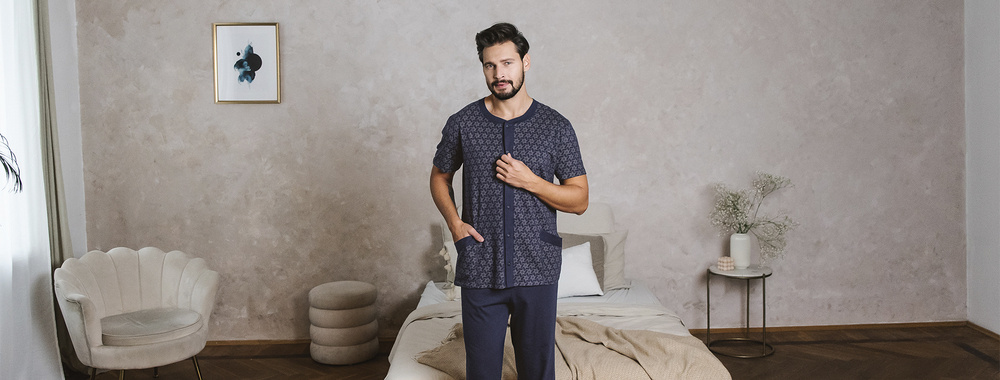 Pijama de hombre de algodón de manga corta y pantalón largo. Extremadamente agradable para la piel gracias al uso de punto de algodón, que proporciona un alto nivel de confort. El corte clásico será muy cómodo para cualquier hombre. El pijama dispone de prácticos bolsillos situados en la blusa. La parte de arriba estampada y la de abajo azul marino crean un bonito conjunto clásico.