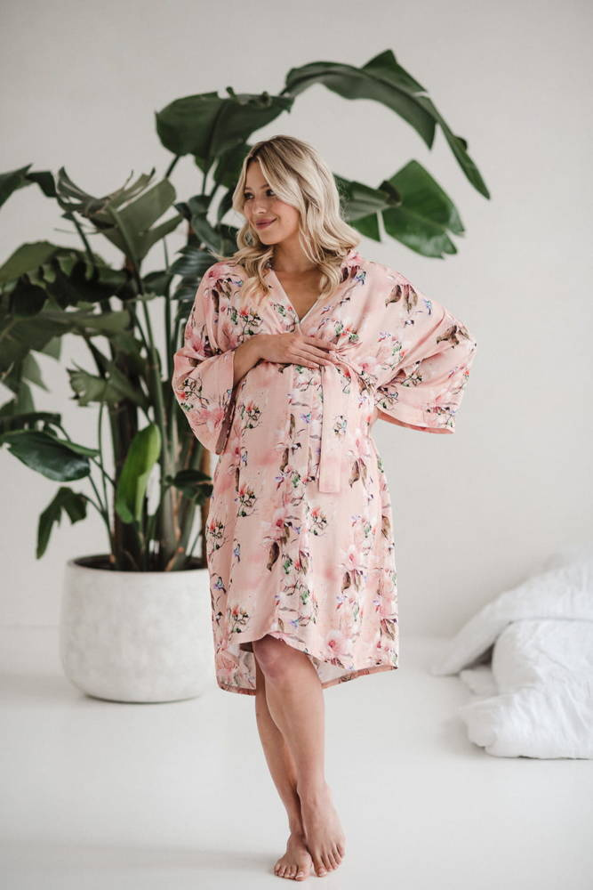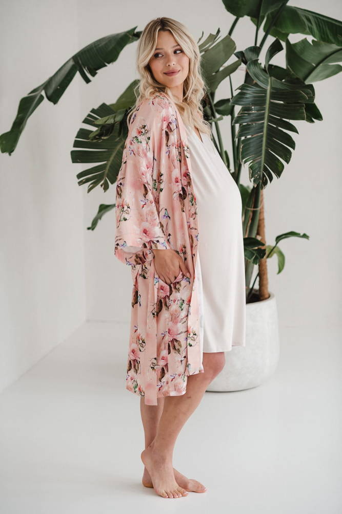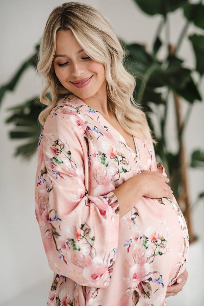 Szlafrok został zaprojektowany z myślą o mamach, dlatego jest nieco dłuższy, abyś spokojnie okryła nim ciążowy brzuszek. Po porodzie bez skrępowania b będziesz mogła spacerować po szpitalnym korytarzu lub na leżąco nakarmiła maluszka w połogu. Posiada kieszenie na niezbędne drobiazgi i pasek do regulowania szerokości.