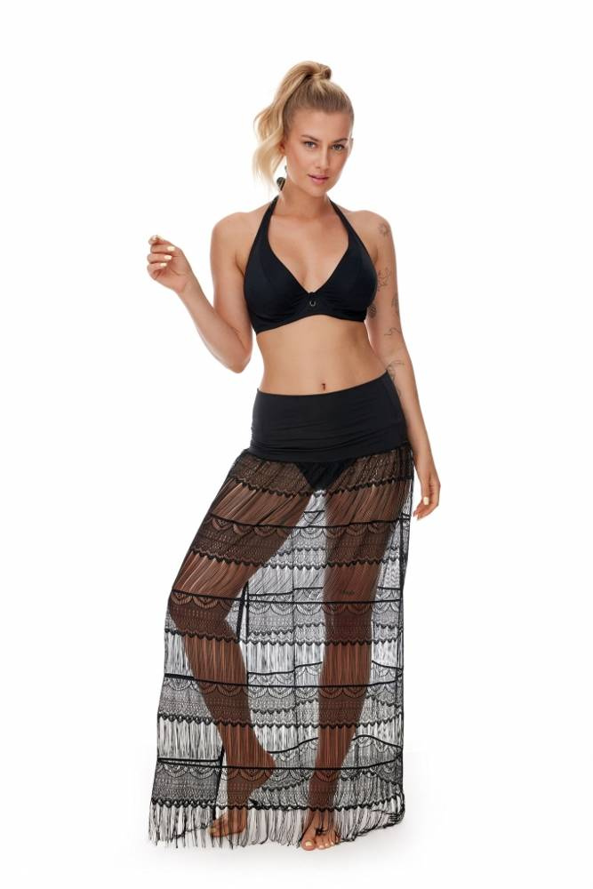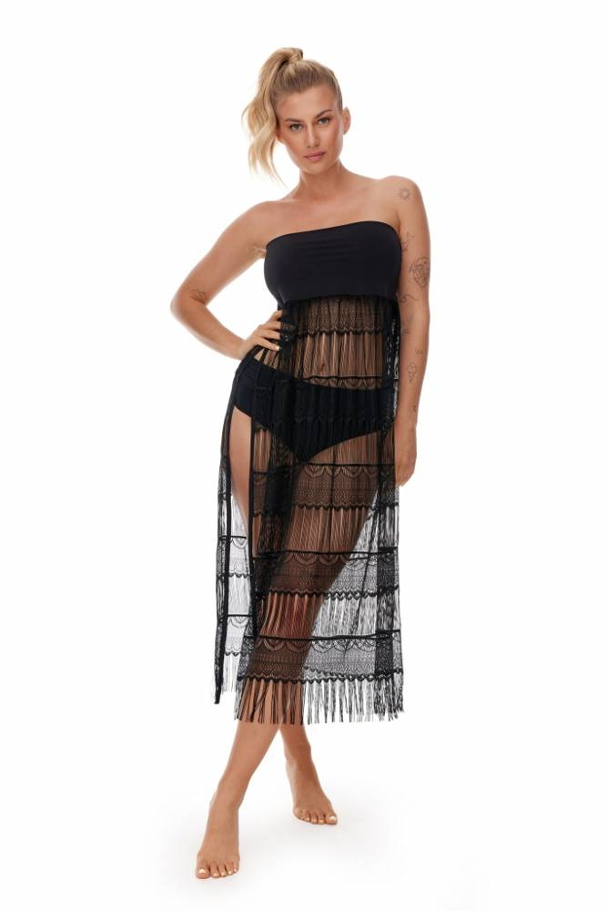 Pareo de playa negro en forma de túnica de estilo boho. Top elástico con escote bandeau. Parte de la falda de encaje transparente con un coqueto recorte y rematada con borlas. Se puede llevar de dos maneras, como vestido o como falda. Ideal para la playa y como complemento de un conjunto veraniego.