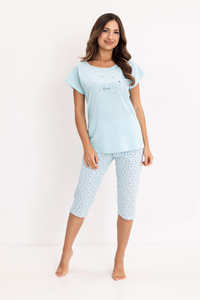 Pijama de señora 735 Regina turquesa - algodón, manga corta, pantalón 3/4, estampado decorativo